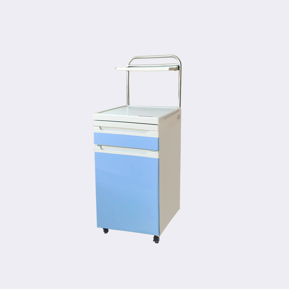 整體布局:頂部安裝儀器架,側面設有伸推式不銹鋼毛巾架,上面一層為抽板,抽板預設杯子及溫度計放置凹槽。便于患者放置茶杯等,第二層為抽屜,可供患者放置物品,第三層為單開門柜子,內設固定隔板,可放置熱水瓶等