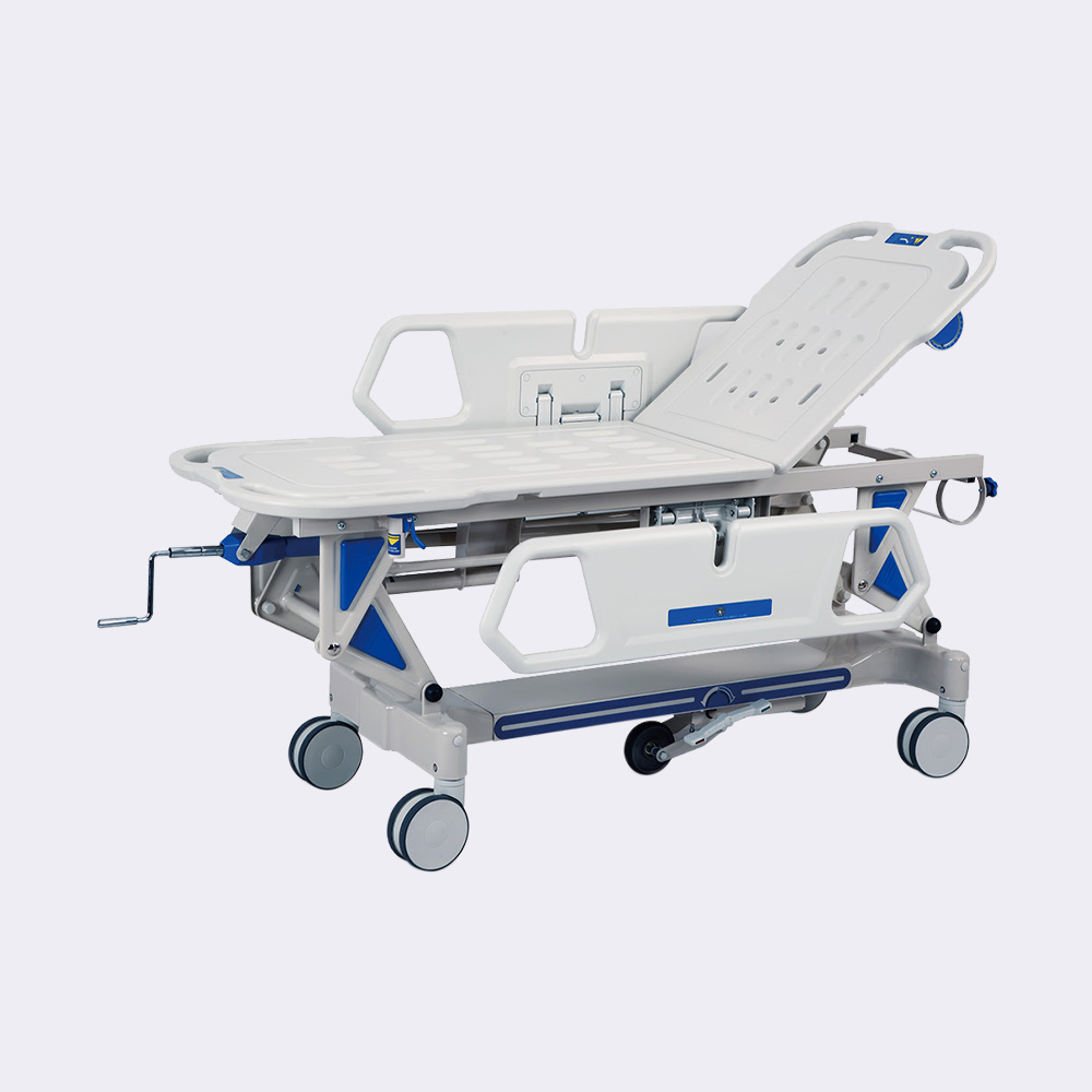 醫用轉移車,順時針方向搖動搖手時,車體上升,逆時針方向搖動,車體下降